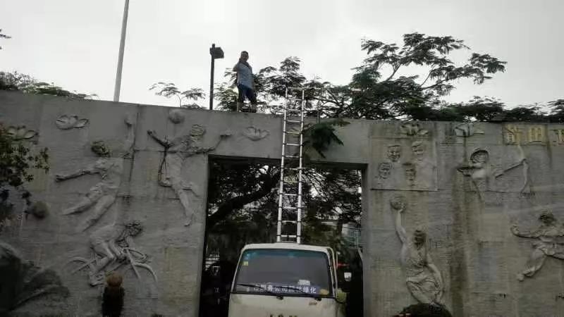 体育中心南广场(游泳馆)前浮雕高空作业