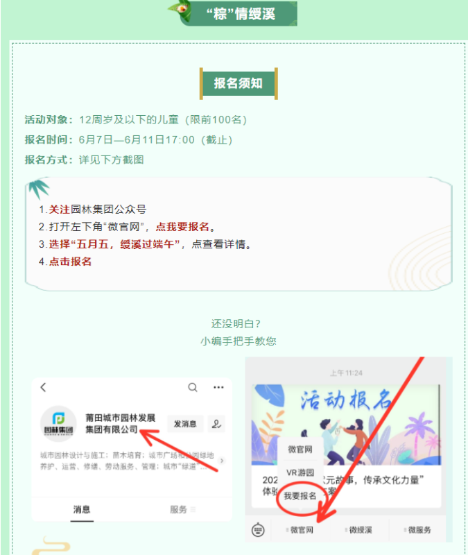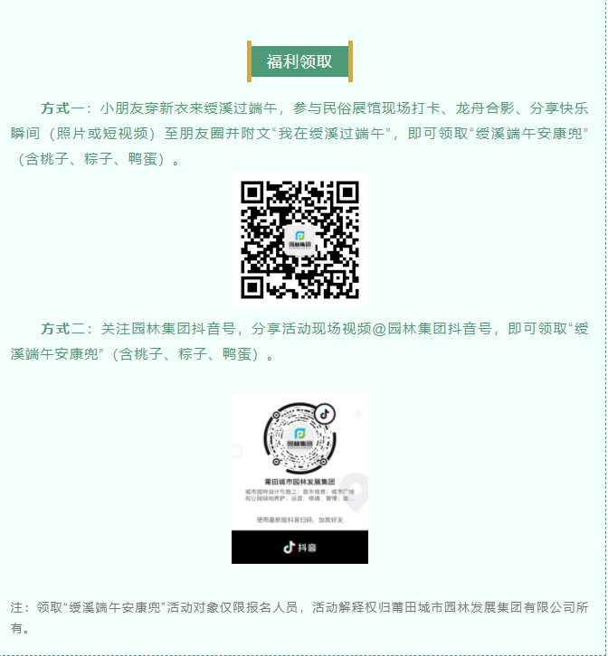 农历五月初五是端午节 俗称端阳或重五 兴化方言称"五日节” “初一糕,初二粽 初三螺,初四艾 初五爬龙舟,初六嘴企企” 每逢端午,记忆中这口口相传的 莆田方言童谣 仿佛又把我们送回那纯真的童年 浓浓乡音的童谣承载着莆仙人民 代代相传的特色端午文化习俗及情怀 五月五,绶溪邀您过端午 搭柴火灶、烧午时水 包粽子、煮鸭蛋 领蛋兜,观龙舟 听琴音袅袅,看溪水潺潺… 此情此景此活动,邀您盼您共体验 话不多说,快来报名 划重点! 仔细阅读以下内容 福利~福利~