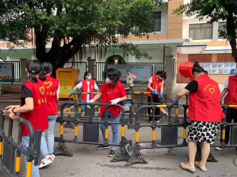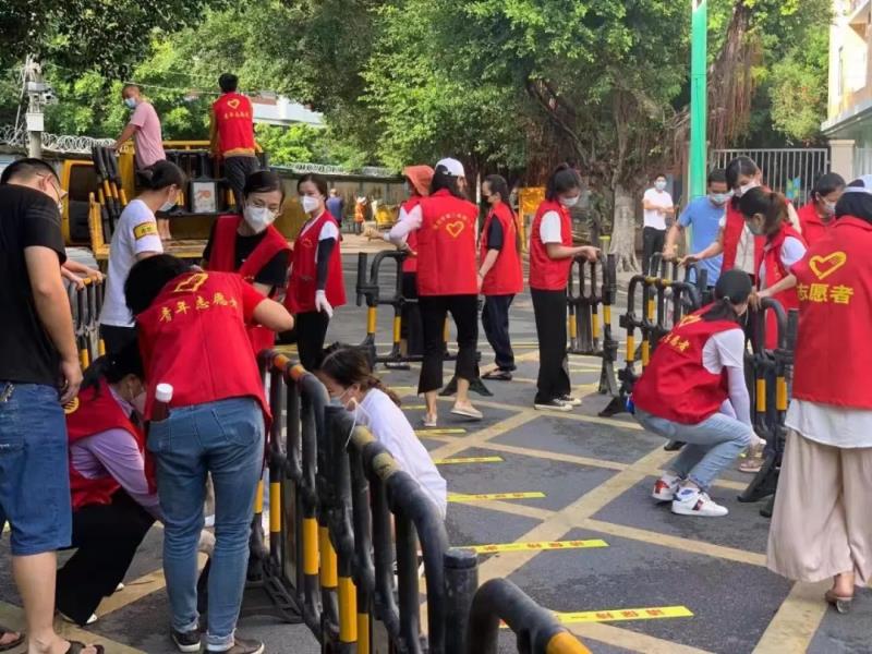 莆田市第二实验小学门口龙桥社区核酸检测点,Home体育志愿者们和社区工作人员准备着各项工作,搭建帐篷、设置围栏、粘贴1米线、搬运物资......准备工作有条不紊的开展。