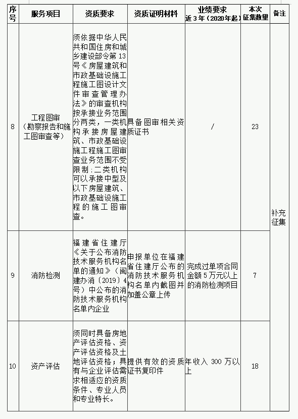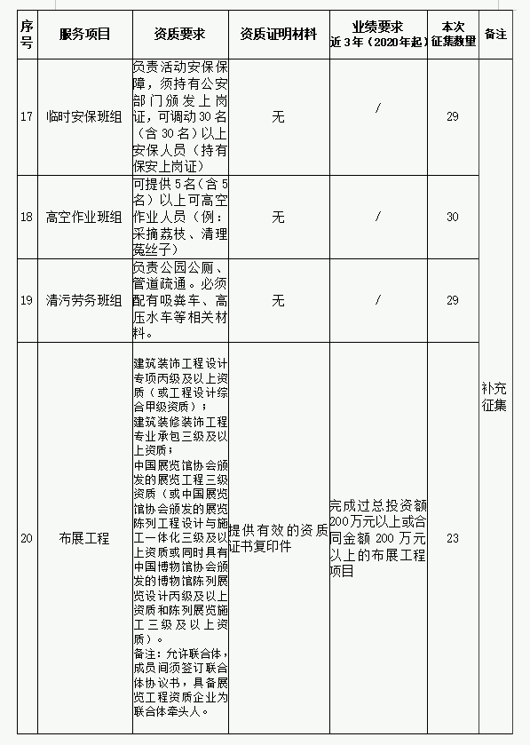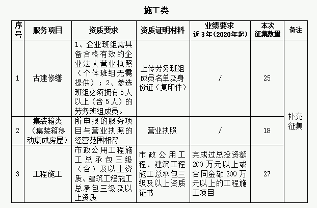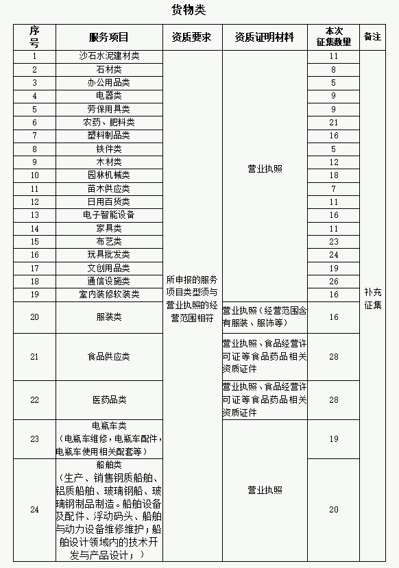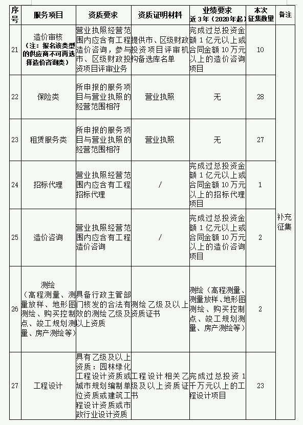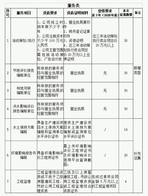 为扩大供应商资源、优化名录库管理,进一步提高招标采购工作效率及名录库利用率,提升供应商服务质量水平,现继续开展征集工作。 一、征集类型及范围 (一)2023年第一批供应商名录库征集类型数量未达30家,本批将继续征集。 (二)根据工作需要,新增类型: 服务类:活动策划/执行类、节地评价报告编制单位类、林地可研编制单位类、洪水影响评价报告编制单位类