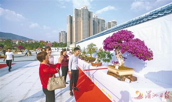 图为各式盆景吸引市民驻足观赏。 湄洲日报记者 陈斌 杨怡玲 摄  莆田网讯 11月8日,第8届莆田市盆景展暨福建省精品邀请展在南湖公园莲花广场开展,展览将…
