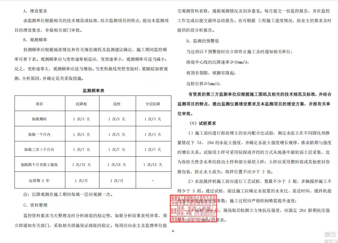 注: 1、具体监测数量根据设计图纸要求或上级行政部门要求为准。 2、本项目具体工作量必须按规范规定、施工设计图纸、招标公告和相关规范执行。 3、报价已包含运输费、材料费、机械费、埋设安装费、税费、技术费及设备进场、退场等全部费用。 4、本项目合同采用包干方式,监测内容需严格按照设计说明要求,总价最高限价为43850元,超过总价最高限价的投标报价视为无效报价。 (二)质量标准: 符合国家《建筑边坡工程技术规范》(GB50330-2013)、《建筑边坡工程监测与检测技术规程》(DBJ/T13-282-2018)、《岩土工程勘察规范》(GB50021-2001)(2009版)、《岩土工程勘察规范》、《岩土工程监测规范》(YS5229-1996)、《福建省建筑边坡与深基坑工程管理规定》闽建建〔2010〕41号等文件强制性标准及设计要求。若上述标准和规范做出修改时,则以修订后的新标准和规范为准,现行文件有出入的则以较严格的为准。中标单位应按招标公告条件的要求完成本项目,并承担因观测质量缺陷造成的责任。 施工范围:根据本工程施工图设计文件及相关规范要求所需完成的监测内容。 (三)特别要求: (1)具备符合本项目专业要求的合格有效的工程勘察专业(岩土工程或物探测试检测监测)乙级及以上资质; (2)报价单位须在Home体育育有限公司完成注册并公示的工程勘察类的供应商。 需提供有效的证明材料复印件并加盖报价公章。(资质证明、报价单、营业执照,第2项无需提供) (四)工期要求: 本监测工期含施工阶段及完工后阶段监测(暂按2年),根据相关规范标准时间节点要求分点进行测量观测,观测质量须符合国家现行规定标准。 (五)特别约定: 1、中标人应按约定时间完成工作,若中标人原因造成延期,毎延期一天处罚500元,但累计处罚不超过监测费用总额的10%。 2、招标人要求中标人前来商讨本项目工作范围内的工作,中标人应在接到通知后24小时(外地的48小时)内到场,若中标人未到场的,每延迟一次罚款500元(但累计不超过监测费用总额的10%)。 3、本工程监测分阶段进行,过程周期较长,发包价不随时间及市场的变化而调整。 4、本项目具体监测数量根据建设主管部门要求、施工图纸要求为准,发包价不随工作量的变化而调整。 二、商务条件 1、交付时间:实际工期依进度调整 。 2、交付条件:按招标公告要求严格进行交付,监测质量符合国家现行规定标准。 3、履约保证金:中标总价的5%。可采用现金转账或银行保函或担保保函等方式提交。说明:收取中标价的5%履约保证金,在中标人完成提供招标公告规定范围内的所有项目并提交正式书面报告之日起15个工作日内无息返还。 4、付款方式: