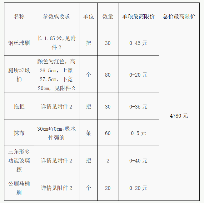 一、报价要求 (一)报价时需在产品规格选项一栏点击“填写单价”填报各项产品单价,并汇总后填报下方的总价。 (二)自行下载附件,按我公司发出的产品规格要求及单位数量填报完整资料,并加盖公司印章后以图片形式上传至响应文件。 (三)本批采购设单项最高限价和总价最高限价,报价时,不可超出本批采购的单项及总价最高限价范围。 备注:以上报价均包含税费、运费等费用。 二、评标方式:本项目采用总价最低价中标法。(若中标价相同,将采取随机抽取方式选择1家中标单位)。 三、送货方式 (一)供货地点: 绶溪公园南大门仓库 (二)供货次数:分 1 次供货 (三)提供样品: / 四、安装方式: / 注:未满足上述“报价要求”中任意一点,将直接视为无效报价。 联系人:小陈,05942259119 附件:1、公开询价报价表/upload/202303/08/202303081151365800.xlsx 2、样式图片/upload/202303/08/202303081151457666.doc